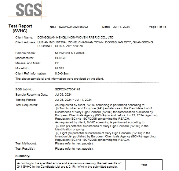 - 無紡布2024年SGS環(huán)保測試報告 注:測試結論依賴于對高關注物質(zhì)如硼、鉻、砷等元素含量的檢測。 ...
